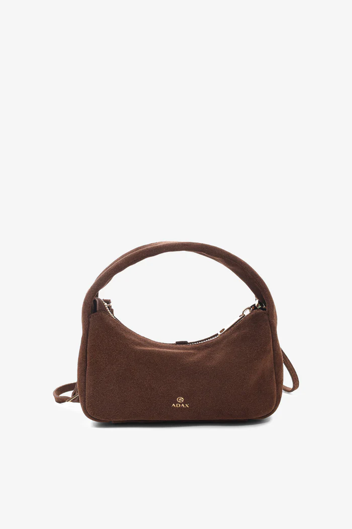 Elegante bolso de hombro de ante suave con asa corta y correa ajustable. Cuenta con cierre de cremallera superior y un amplio compartimento para objetos esenciales. Estilo minimalista con una silueta suave y redondeada.